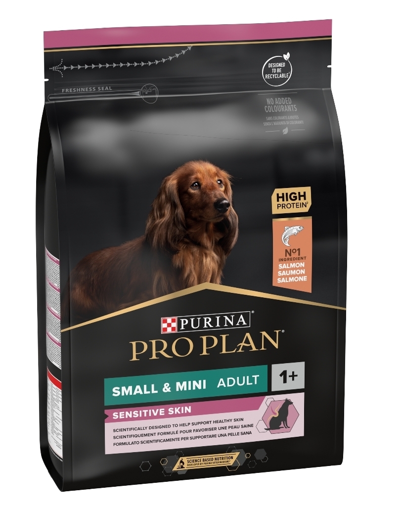 Purina PRO PLAN Sensitive Skin SMALL&;MINI ADULT has been developed for adult dogs of small &; mini breeds (less than 10 kg weight). This dry dog food contains vitamin D, minerals and specific levels of omega-3 (0.8%) to help support healthy teeth and gums. It is rich in high-quality salmon and provides optimal nutrition for your small &; mini dog's adventures from 12 months until 9 years of age, when you should transition to the Age Defence recipe.